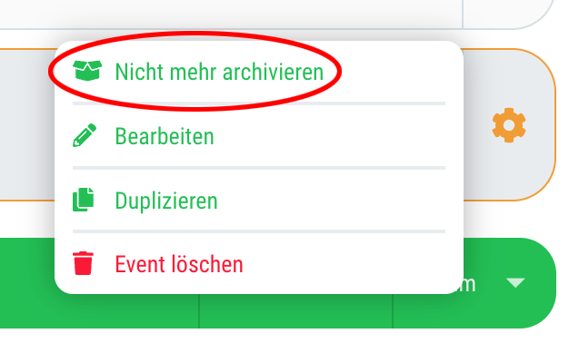 • Klicke auf das Zahnrad-Symbol neben dem archivierten Event